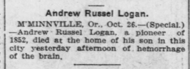 | Andrew Russell Logan | Death | 1904 | Oregon Death Records, 1864-1971 |