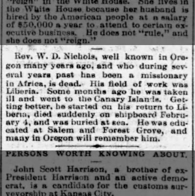 In 1891, William was transferred by the Methodist Church to serve as a missionary in Liberia, where he was principal of the Cape Palmas Seminary (Statesman Journal, 1893). During his service he became ill and traveled to the Canary Islands to recuperate. Although his health is noted to as have improved, he died suddenly during his return voyage to Liberia and was buried at sea on February 4, 1893.