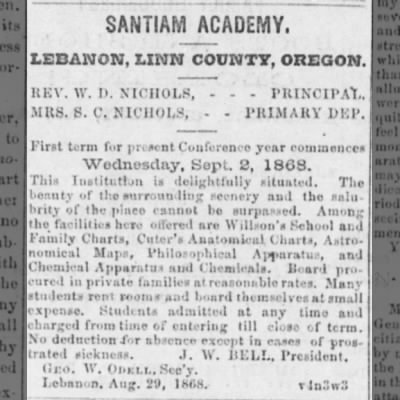 Maxwell, B. (1936). Santiam Academy, Lebanon, Oregon [Photograph]. Salem Public Library. Retrieved November 21, 2025, from https://upload.wikimedia.org/wikipedia/en/a/a8/Santiam_Academy.jpg.